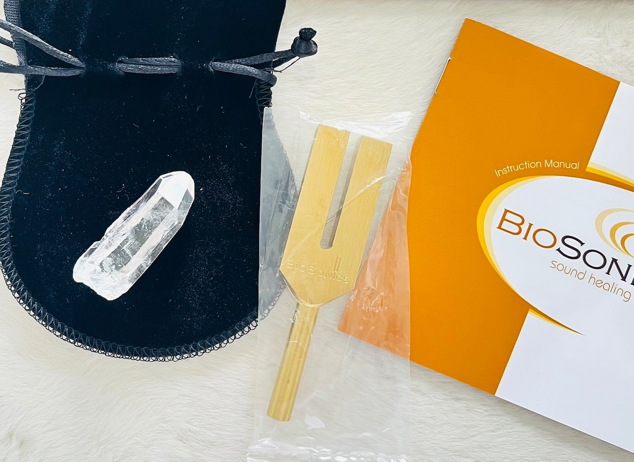 「レムリアンシード クリスタル」の平らな側面、あるいは底面に「クリスタルチューナー(音叉)」を軽く当てて響かせてください。